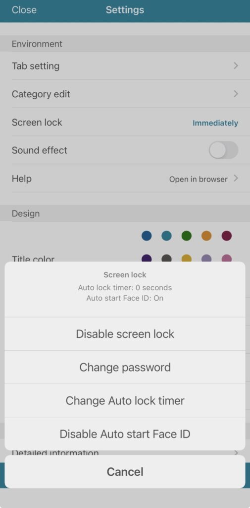 IMPORTANT: All these settings are listed under the ‘Screen Lock’ settings after tapping the gear icon in the upper-right corner of accoca’s home screen. The gear is visible upon initial setup or after regaining entry to the vault.