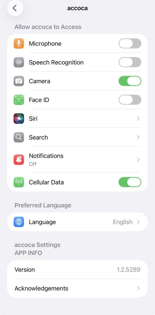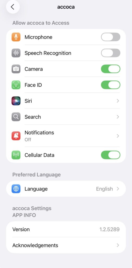 Of course, not everyone wants FaceID to launch automatically. accoca makes it easy to disable auto-start FaceID from within its settings. FaceID can also be turned off completely in your iPhone’s settings, requiring a user-defined PIN code for every login attempt.